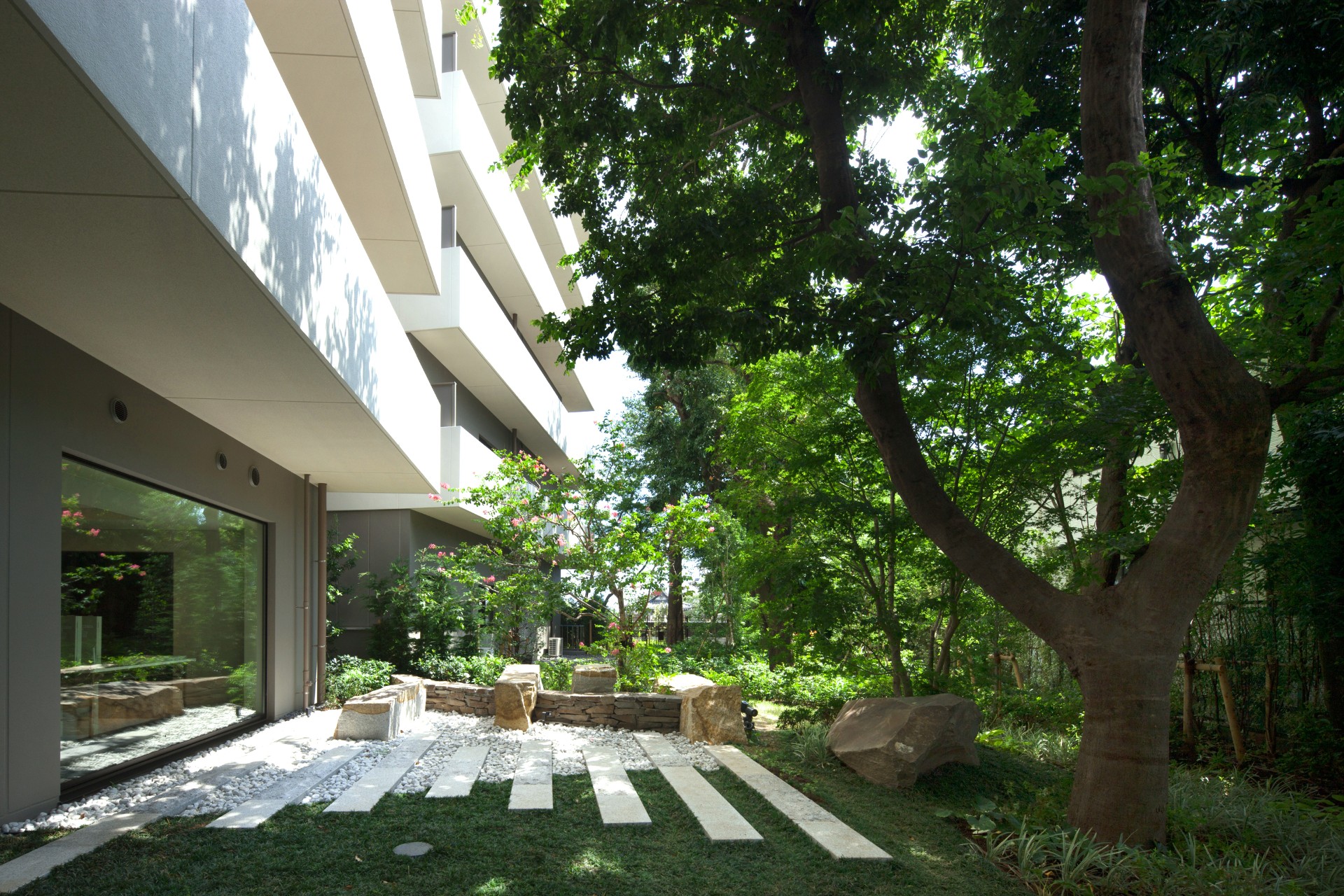 既存石垣は存置する要望より、高さ制限をクリアするプランとペントハウス的な階高を抑えた3階からは南は神戸港、北は六甲山の眺望が楽しめる。1階、2階の南面は鉄骨柱により大きな連窓を設け、BBQテラス、プール、洗面・脱衣室及びナノバブルバス、ドライサウナをゲストと楽しめる空間とした。南側隣地住戸との間にはオーニングテントと、なるべく多くの木々を植えプライバシーに配慮した。