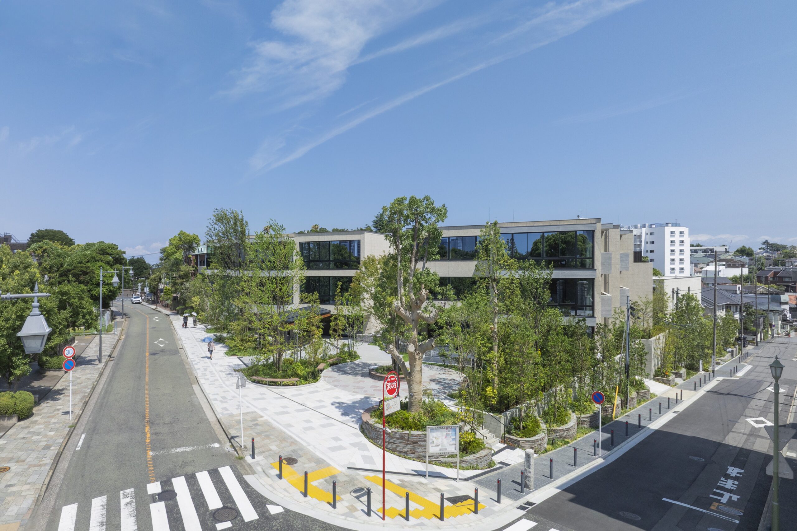 建物は道路境界線からは大きく引きを取り、かつての建物の壁面ラインを守るように配慮した。外壁もかつての建物の色味を尊重したレンガタイル仕上げとする事で、歴史ある街並みの重みに呼応させたモダンなデザインを意図している。また、大きなソメイヨシノの既存樹を残し、建物は樹々の向こうに垣間見えるアプローチとなっている。