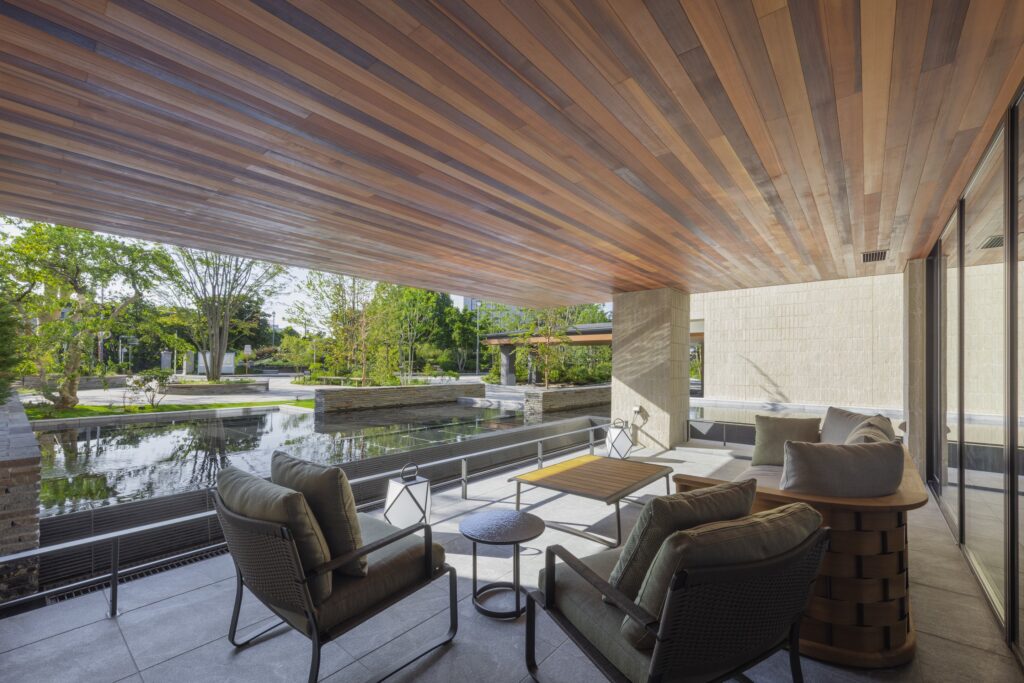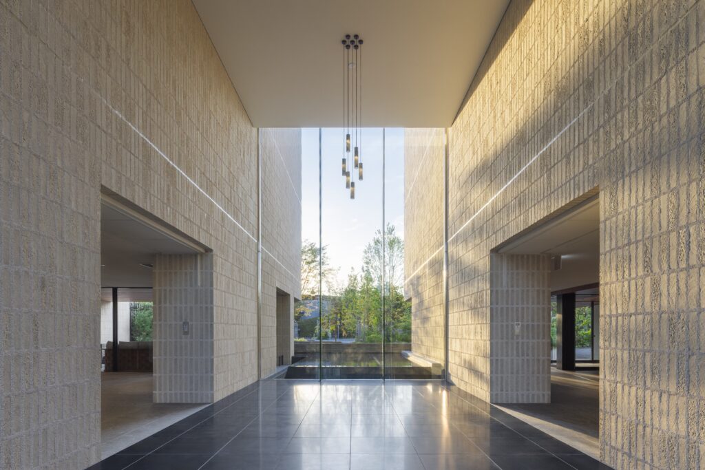 The architecture has a U-shaped structure centered on the courtyard with a water view. We tried to make the indoor and outdoor materials continuous.