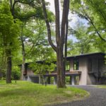 But openings toward the greenery on the neighboring side are wide and glazed to bring the greenery into the interior.